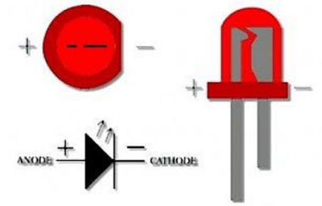 Gambar tersebut menunjukkan bahwa LED memiliki dua kaki, yaitu anoda dan katoda. Kaki anoda memiliki ciri fisik lebih panjang dibandingkan kaki katoda ketika LED masih baru. Kaki katoda ditandai dengan bagian body LED yang dipapas rata.