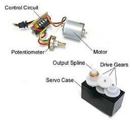 Motor servo adalah motor DC dengan sistem umpan balik tertutup yang terdiri dari motor DC, gear, rangkaian kontrol, dan potensiometer. Potensiometer berfungsi untuk menentukan sudut putaran servo.