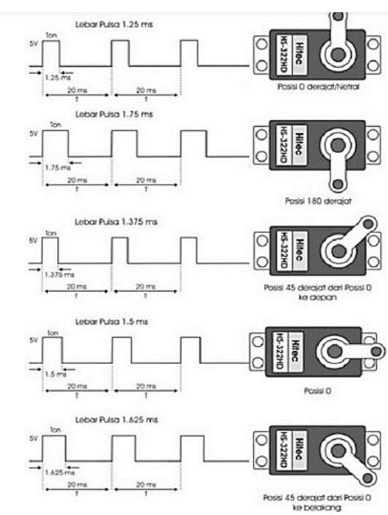 Sudut putar motor servo dikendalikan oleh sinyal PWM (Pulse Width Modulation) dengan frekuensi 50 Hz. Motor servo dapat bergerak pada sudut tertentu seperti 0°, 90°, dan 180°.