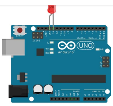 Sebuah LED dihubungkan ke Arduino menggunakan resistor sebagai pembatas arus.