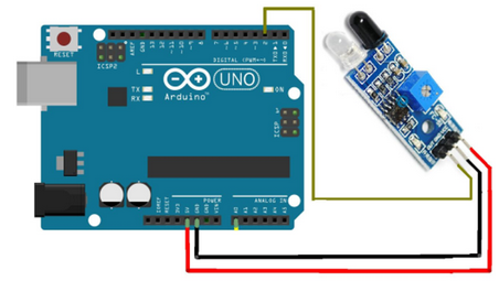 Sensor IR dihubungkan langsung ke Arduino untuk mendeteksi objek di depannya.