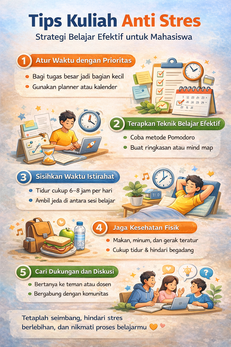 Stres saat kuliah adalah hal yang wajar, tetapi bukan berarti harus dibiarkan. Dengan manajemen waktu yang baik, teknik belajar yang efektif, serta pola hidup sehat, mahasiswa dapat menjalani perkuliahan dengan lebih seimbang dan menyenangkan.